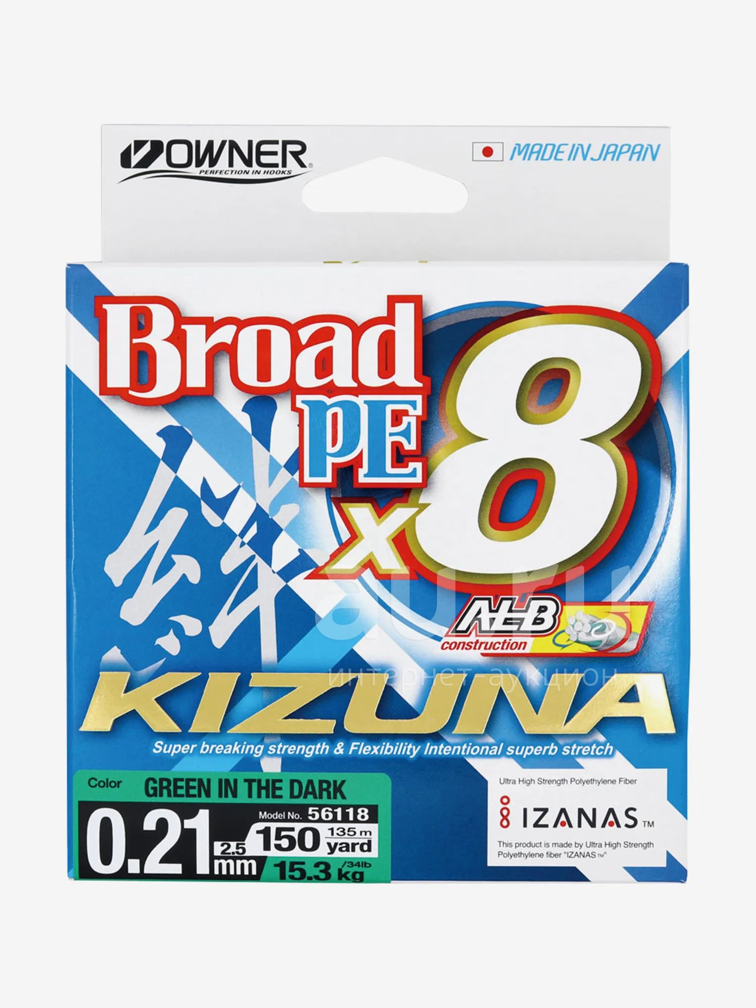 Плетеный шнур Kizuna X8 Broad PE — высочайшего качества. Инновационная технология плетения Anti Loosen Braided Construction позволила достичь невероятно гладкой поверхности и минимального сопротивления шнура во время заброса. Чрезвычайно прочные микроволокна Izanas обеспечили шнуру Owner Kizuna Broad PE x8 повышенную устойчивость к истиранию и деформации. Также уменьшился его вес, что положительно повлияло не только на дальность, но и на точность заброса. Передовая технология плетения ALB из 8 микроволокон сделала этот шнур универсальным: он может использоваться как в спиннинговой, так и в морской ловле. Широкий диапазон диаметров позволяет легко подобрать Kizuna Broad x8 под ваши условия ловли. Выпускается в наиболее востребованных размотках и цветовых решениях. Технические характеристики — Высочайшее качество материала Izanas PE. — Уникальная технология 8-жильного плетения. — Круглое сечение. — Самый высокий показатель прочности на узлах и износоустойчивости. — Увеличение дальности заброса. — Долговечность. — Экологически чистый продукт: при сжигании вредные вещества не выделяются. — Сделано в Японии.