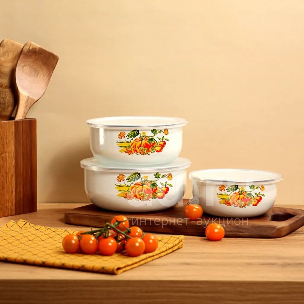 Набор салатников из эмалированной стали «Тыквенный латте»: 3 размера, крышки, стильный дизайн — универсальное решение для дома и дачи