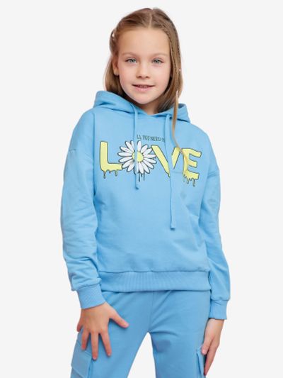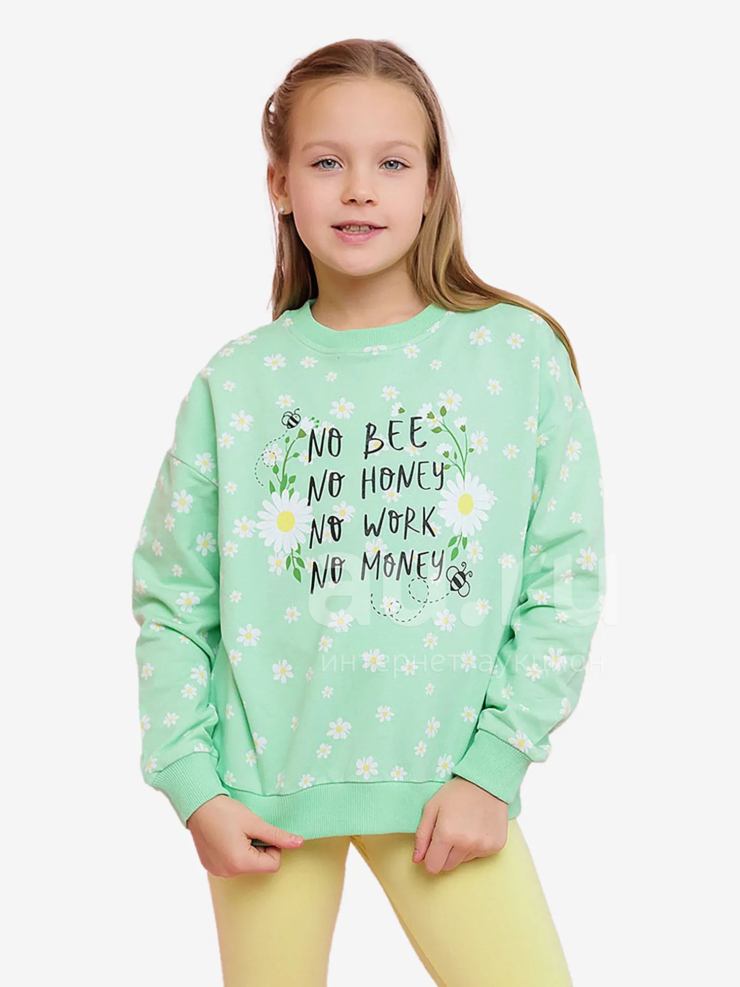 Укороченный детский свитшот в мятной расцветке с рисунком в виде ромашек и надписями спереди. Стильный и практичный свитшот изготовлен из хлопка и полиэстера. Займет особое место в гардеробе и сердце подростка. Характеристики: ткань: футер-двухнитка (90% хлопок, 10% полиэстер).