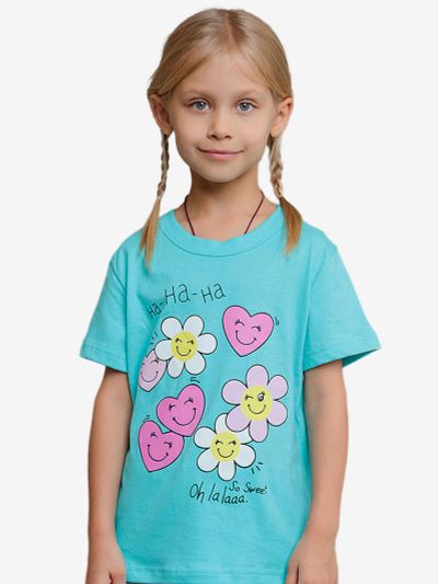 Футболка с коротким рукавом в бирюзовой расцветке из натурального хлопка для девочки. Детская футболка с ярким летним рисунком выполнена из мягкого трикотажа. Легкая ткань со 100% хлопковым составом хорошо пропускает воздух и позволяет телу дышать. 100% хлопок.