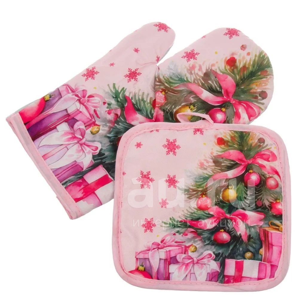 Набор кухонный 2 шт (варежка 27х17 см + прихватка 17,5х17,5 см) «Розовая елка»: стильный подарок для уютных праздников, защита рук и декор кухни.