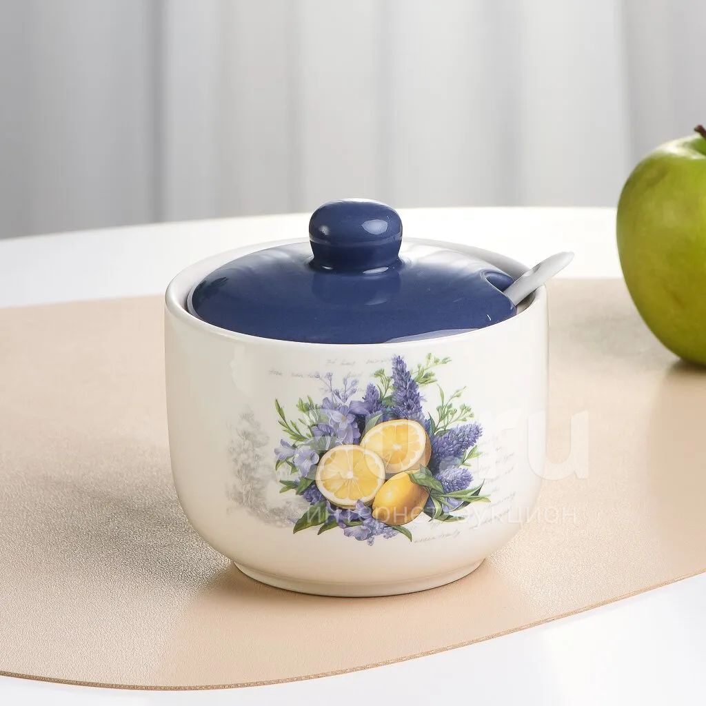129руб.Сахарница 500 мл, доломит, 11.2х11.2х11 см, с ложкой, Daniks, Лаванда
