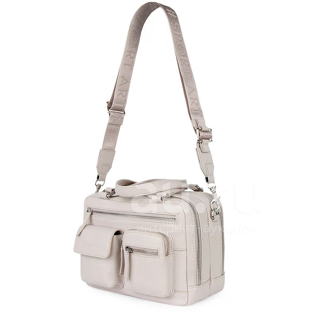 Вместительная сумка-органайзер Женева Sport изготовлена из кожи светло-серого оттенка. Снаружи предусмотрены пять карманов и отделений разных форматов, чтобы разместить в быстром доступе все необходимое. Два основных отделения, оформленные жаккардом и кожаными вставками, застегиваются на молнию. В первом отделении - текстильный ремешок для ключей, два кармана на молниях, два отсека для мелочей и три держателя, чтобы хранить ручку или блеск для губ, во втором – два кармана на молнии. В комплекте съемный регулируемый ремень-траколла.