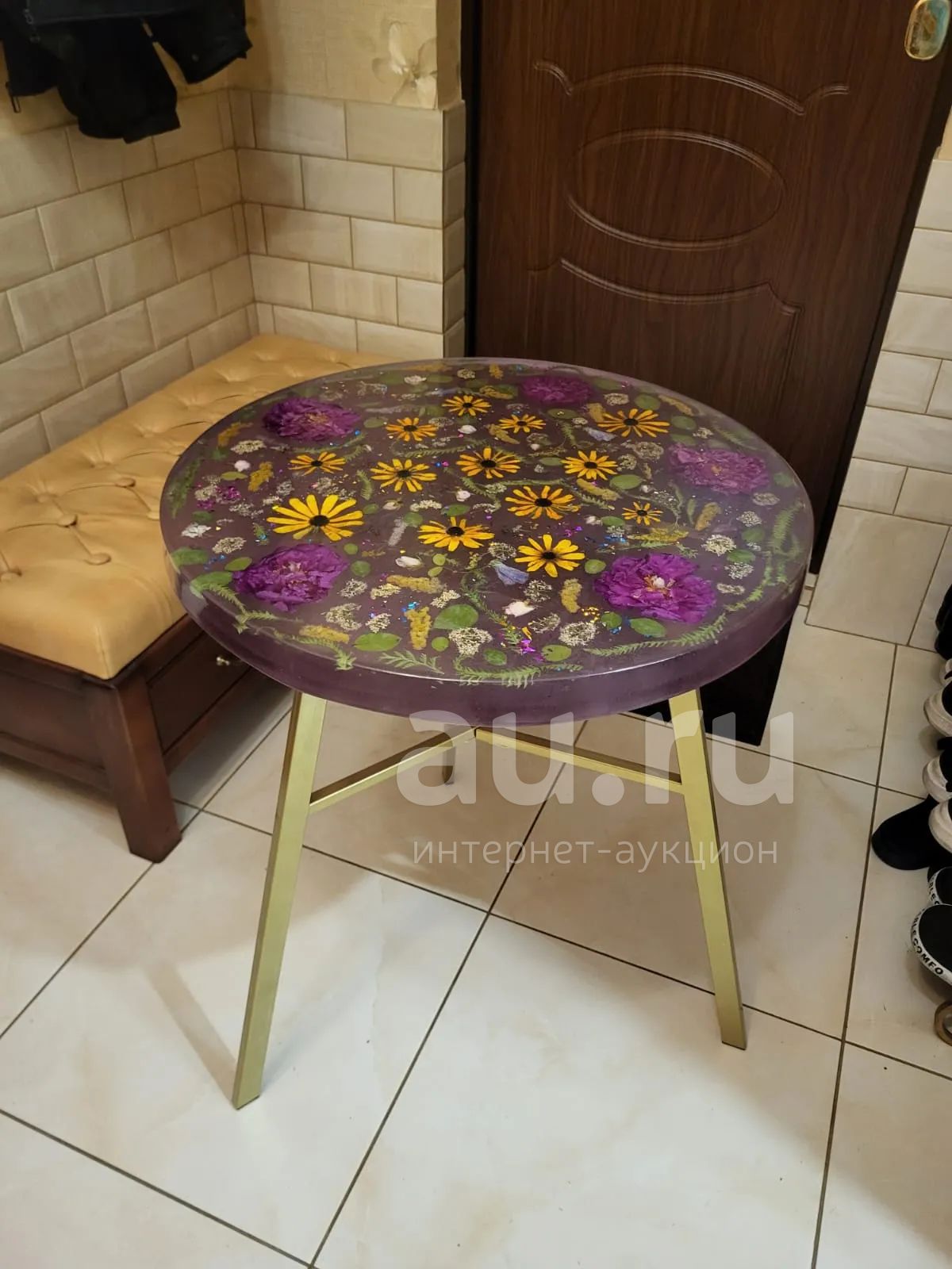 Стол из эпоксидной смолы с сухоцветами. Диаметр столешницы - 60 см, толщина столешницы - 4 см, вес столешницы - 15 кг, высота стола - 75 см.
