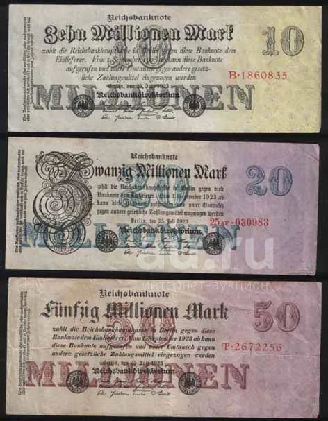 Банкноты Германии 10 млн, 20 млн, 50 млн 1923