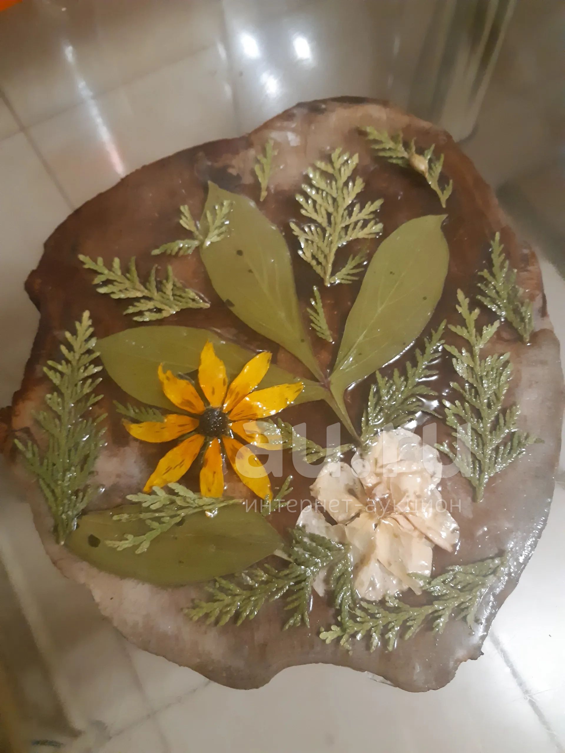 Срез дерева 23-25 см. Края посветлели в процессе высыхания смолы, так как сушила в дождливую погоду. Поэтому не подходит для изготовления столешницы, но приделать крючок и на стену повесить можно.