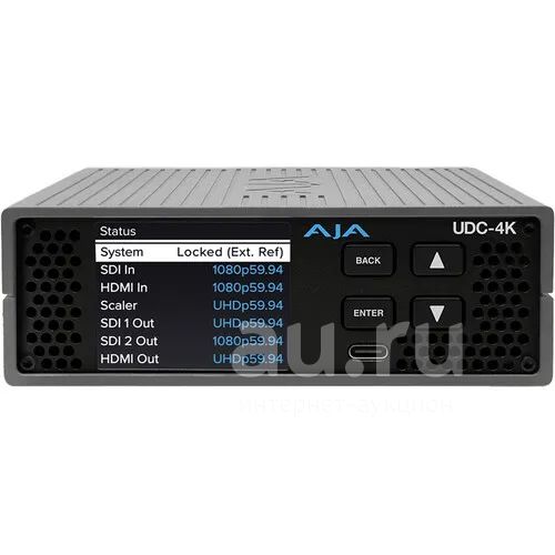 Обзор AJA UDC-4K Профессиональная конвертация видео Разработанный для профессиональных рабочих процессов, мини-конвертер UDC-4K от AJA обеспечивает вещательное качество преобразования, масштабирования и синхронизации в прочном и компактном корпусе. UDC-4K поддерживает видео до DCI 4K и оснащен большим ЖК-дисплеем состояния, а также входом и выходом BNC и HDMI. Повышающее и понижающее преобразование UHD 4K Поддерживает повышающее, понижающее и перекрестное преобразование между видеоразрешениями DCI 4K, UHD 4K, 2K и HD на входах и выходах SDI и HDMI. Прочная, компактная конструкция Алюминиевый корпус и компоненты, соответствующие стандартам вещательного телевидения, позволяют преобразователю UDC-4K выдерживать высокую плотность размещения компонентов. Преобразователь оснащён цветным ЖК-дисплеем состояния и системой воздушного потока спереди назад для эффективного охлаждения. Синхронизатор кадров Встроенный синхронизатор кадров синхронизирует несинхронизированные или несинхронизированные видеосигналы с общей временной точкой, обеспечивая идеальную синхронизацию для многокамерного производства. Преобразование SDI и HDMI Идеально подходящий для сложных установок со смешанными компонентами, UDC-4K преобразует 12G-SDI в HDMI 2.0 и HDMI 2.0 в 12G-SDI с эмуляцией EDID, гарантируя, что подключенный источник всегда будет выдавать на своих выходах предпочтительный формат. Распределение сигнала Встроенный усилитель-распределитель (DA) позволяет UDC-4K функционировать как компактный распределитель сигнала 12G-SDI с функцией перетактирования от одного до четырёх. Он также может распределять преобразованный входной сигнал на один выход HDMI и четыре выхода SDI или пропускать вход SDI через сквозной порт на два выхода SDI и передавать обработанный сигнал на один выход HDMI и два выхода SDI. Вы также можете использовать вход HDMI и сквозной порт для распределения обработанного сигнала на четыре выхода SDI. Поддержка HDR UDC-4K использует 10- и 12-битную обработку для поддержки HDR с передачей SDI VPID и HDMI InfoFrame, а также опциональными переопределениями.