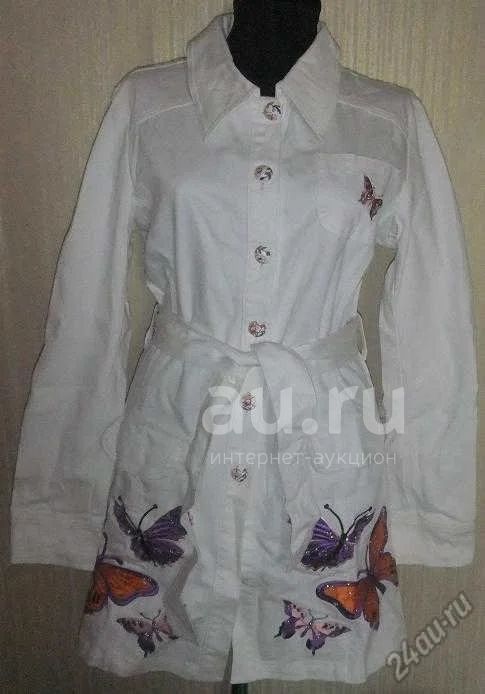 Шикарный, эксклюзивный, джинсовый плащ белоснежного цвета с вышитыми(шелком) бабочками, пуговицы с ручной росписью.