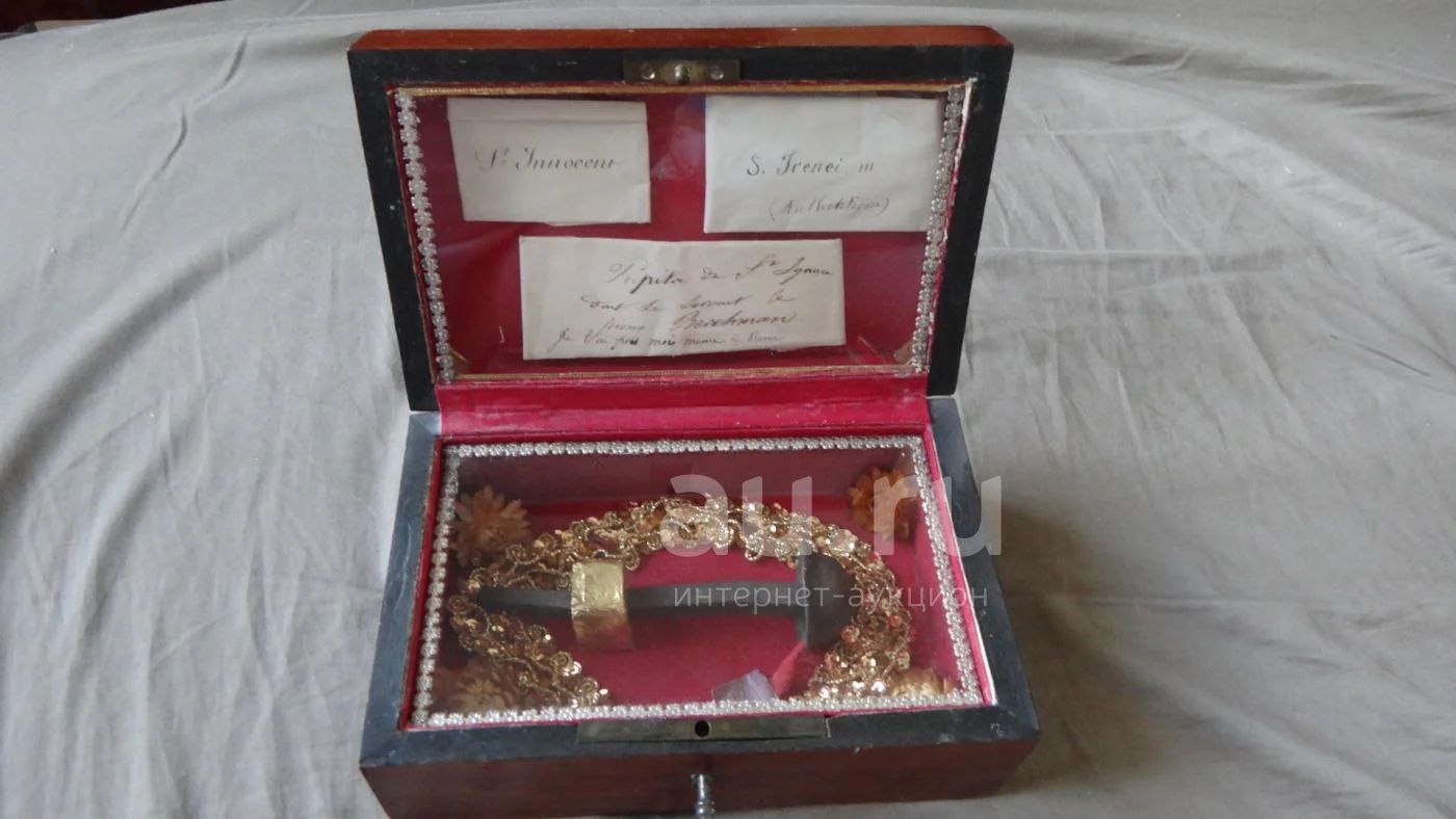 Антикварный мощевик шкатулка - ковчег из дерева с инкрустацией . Внутри точная копия Святого Гвоздя, хранящегося в базилике Святого Креста Иерусалимского в Риме. Такие Гвозди выпускались в течении 19 века ограниченным тиражом и вручались важным паломникам. Каждый Гвозь содержит микрочастицы Подлинного Гвоздя Святого Распятия Христова и освящен у оригинала. Имеется ненарушенная церковная печать, прикрепленная через отверстие в шляпке гвоздя. Она гарантирует подлинность святой реликвии. Размер Гвоздя 12 см. Шкатулка 18,5 х 12 х 7 см. Кроме Гвоздя, в крышке шкатулки находится три реликвии под стеклом : св. мученик Иннокентий младенец ( один из Вифлеемских младенцев, от Ирода убиенных) , свт. Ириней Лионский, священномученик Игнатий Богоносец)