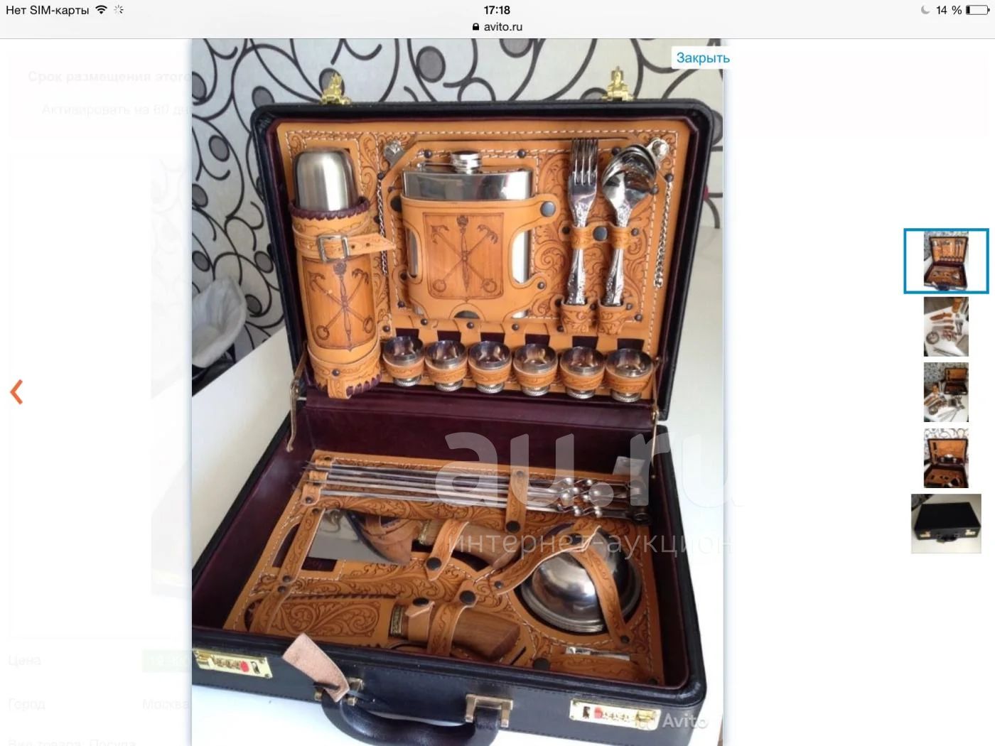 Подарочный набор в кейсе! Кейс из натуральной кожи с картиной ручной работы. Предметы из нержавеющей стали. Чехлы на нож и термос из натуральной кожи. Набор на 6 персон. Отличный подарок для солидных людей.