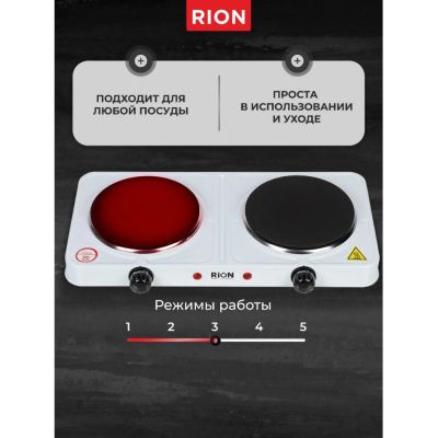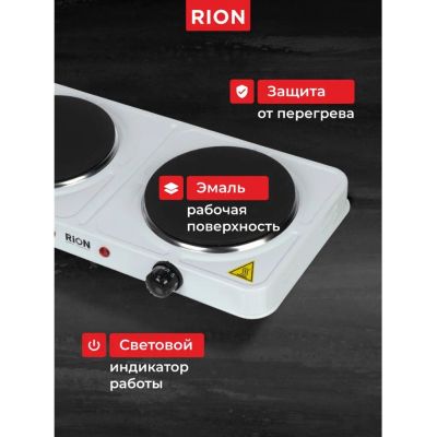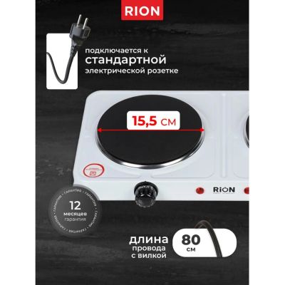 Плита электрическая Rion, 2000 Вт, 2 конфорки, диск, эмаль, механическая, переключатель поворотный, белая