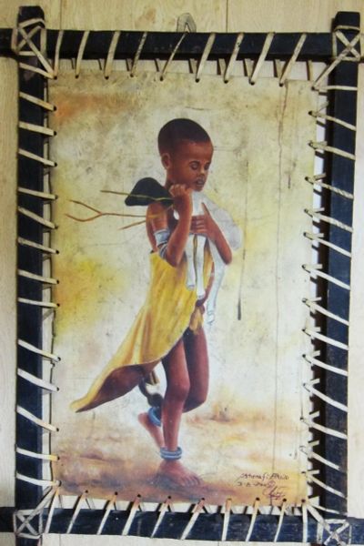 Картина на коже "Эфиопия. Детство." XX век, 80 * 55 см, кожа. Эфиопия. Африка. Интерьер.
