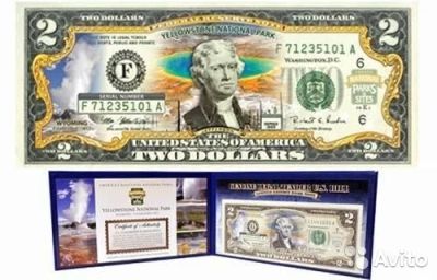 Банкнота 2 доллара США Yellowstone парк,цветная