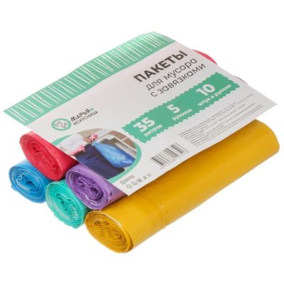 Пакеты для мусора 35 л, 10 шт, 32.5 мкм, с завязками, 5 рулонов, цветные, Марья Искусница