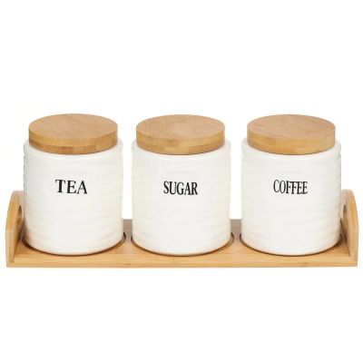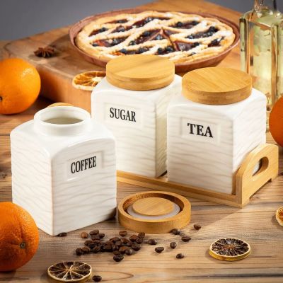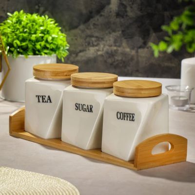 Банка для сыпучих продуктов, керамика, 3 шт, с крышкой, на бамбуковой подставке, Y6-6465