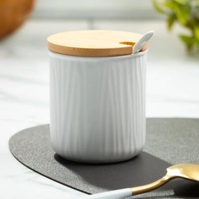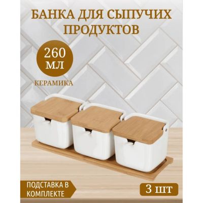 Банка для сыпучих продуктов, керамика, 0.26 л, 30х9.8 см, 3 шт, с крышкой, с ложкой, бамбуковая подставка, Y4-5027, белая