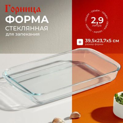 Форма для запекания стекло, 23.7х39.5х5 см, 2.9 л, прямоугольная, с ручками, Горница, Ф2301