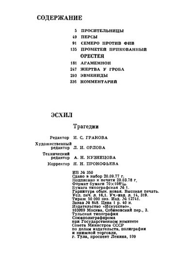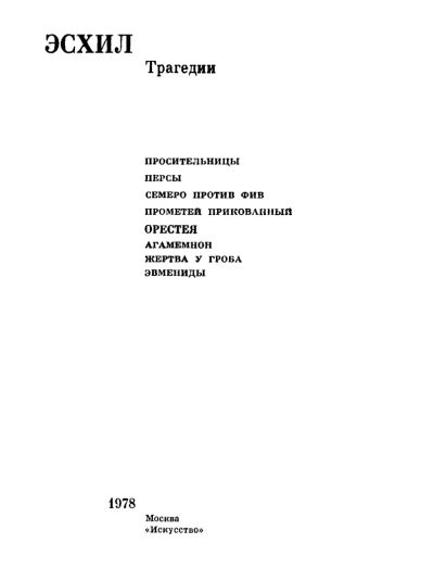 Эсхил - Трагедии. / Серия: Античная драматургия. / Издательство: Искусство (1978). / Перевод с древнегреческого: Соломон Апт. Редакторы: И. Гракова, Л. Орлова. Художник Н. Калинин.