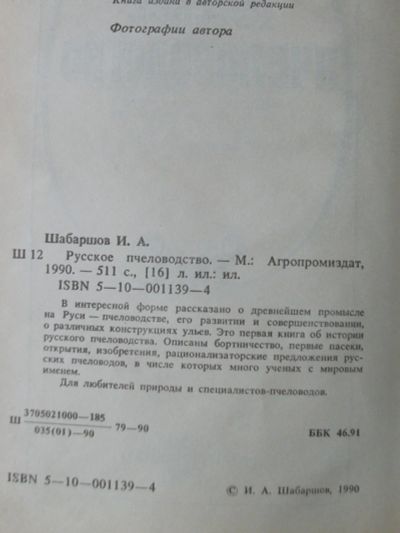 Книга Русское пчеловодство 1990 Шабаршов увлечение работа пасека новая