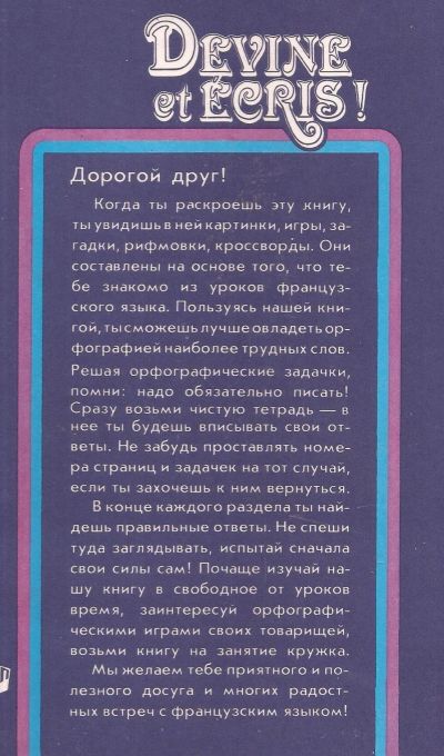 Левицкая Галина, Козлова Галина - Devine et ecris! Занимательная орфография. Пособие для учащихся 5-8 классов средней школы. / Изд.: Просвещение. / 5-09-002776-5 / Рецензенты: В. Гак, В. Летнева. Художники: Б. Валит, Е. Шабельник.