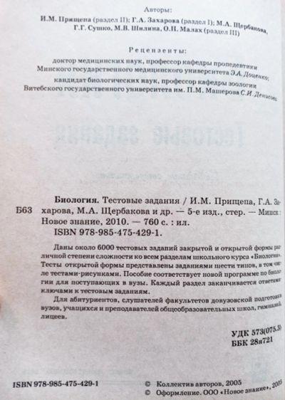 Прищепа Инна, Захарова Галина, Щербакова Марина, Сушко Геннадий, Шилина М., Малах О Биология. Тестовые задания. / 978-985-475-429-1 / Рецензенты: Э. Даценко, С. Денисова. Редактор Л. Крупич. Художник С. Ковалевский.