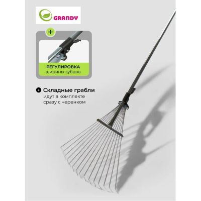 Грабли веерные, 15 зуб, металл, Grandy, Grandy, 15.5-52х120-155 см, раздвижной, черенок металлический, 402505
